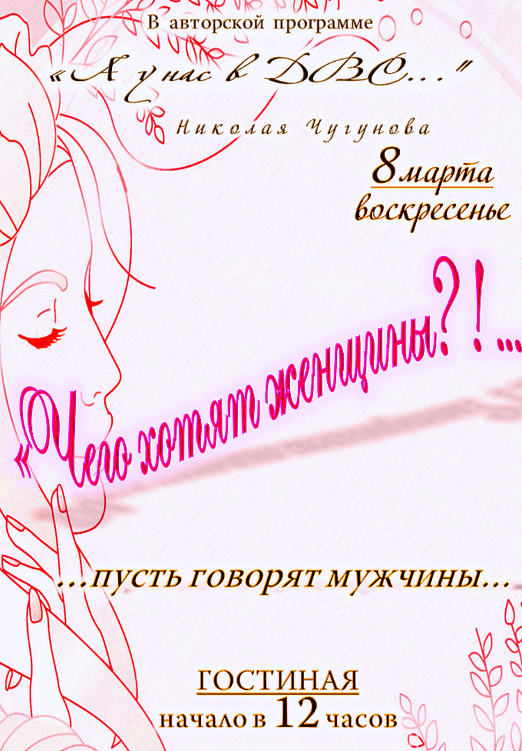 "Чего хотят женщины?!... 08.03.2026 Время: 12:00 Адрес: г. Москва, шоссе Энтузиастов, д. 88, Гостиная